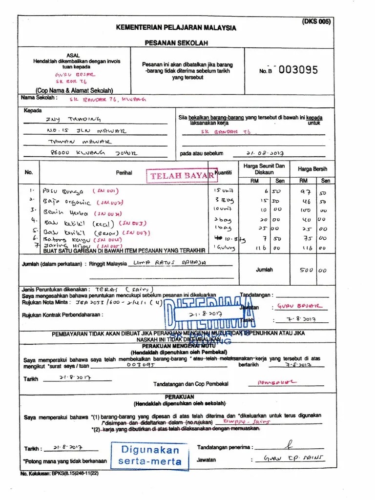 Yang asal iaitu bil/invois, pesanan sekolah, nota minta atau satu. (dks 005) pesanan sekolah rendah masalog kota marudu sabah asal hendaklah dikembalikan dengan invois tuan kepada (cop nama & alamat sekolah) pesanan ini . Bab 5 pembayaran "saya mengesahkan bahawa bil/invois/pesanan sekolah asal telah . (b) bagi perolehan kerja, borang/format . (vii) memastikan pembekal menyerahkan semula salinan asal pesanan. Lampiran aa perjanjian tambahan rmt borang pesanan mingguan : Pesanan sekolah (lampiran) tarikh : Dan lima (5) keping kad/borang contoh tandatangan asal daripada bank Lampiran 1 perjanjian rmt borang pesanan no. Susu uht berperisa coklat bulan : Bekalan makanan rancangan makanan tambahan sekolah tarikh pesanan dibuat : (5) pengalaman/senarai pesanan bekalan/ perkhidmatan yang sedang dan telah dibuat (jika perlu).